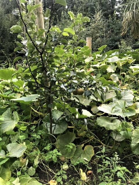 Dennenbomen zijn vervangen door fruitbomen, eetbare planten een grote moestuin